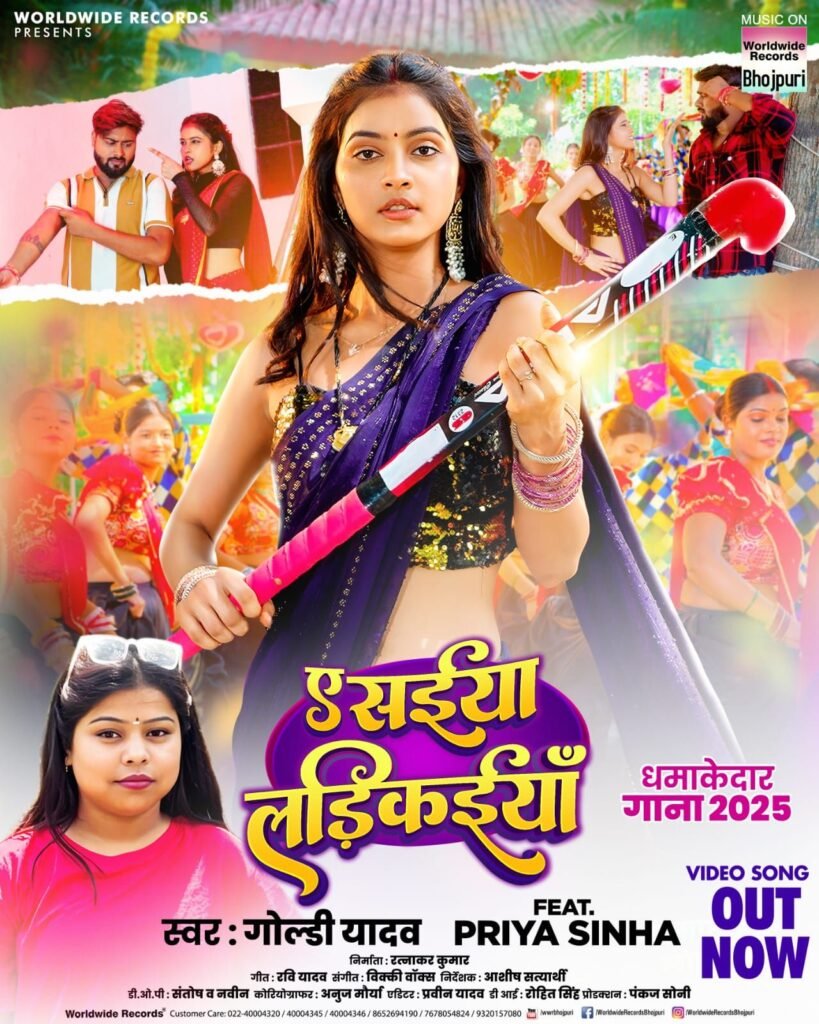 वर्ल्डवाइड रिकॉर्ड्स प्रस्तुत लोकगीत ‘ए सइयां लड़िकइयाँ” के निर्माता रत्नाकर कुमार हैं। इस गीत को सिंगर गोल्डी यादव ने गाया है। इसके वीडियो में एक्ट्रेस प्रिया सिन्हा ने शानदार अदायगी किया है। इस गाने को गीतकार रवि यादव ने लिखा है, जबकि संगीतकार विक्की वॉक्स ने मधुर संगीत दिया है। वीडियो डायरेक्टर आशीष सत्यार्थी, डीओपी संतोष यादव एंड नवीन, कोरियोग्राफर अनुज मौर्या, एडिटर प्रवीण यादव हैं। डीआई रोहित सिंह, प्रोडक्शन पंकज सोनी ने किया है। इस गाने का ऑल राइट वर्ल्डवाइड रिकॉर्ड्स के पास है।