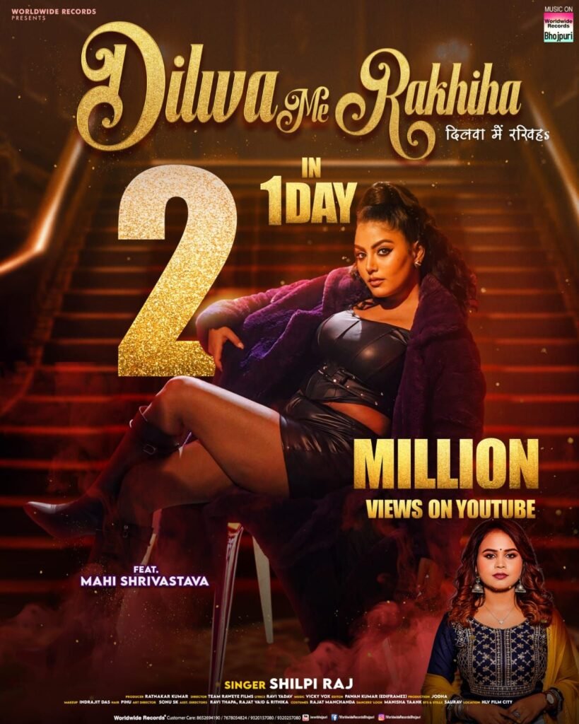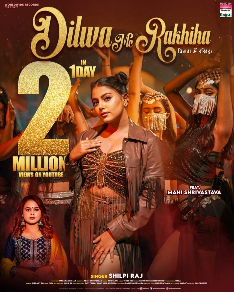 भोजपुरी की फेमस सिंगर शिल्पी राज और भोजपुरी की बेस्ट एक्ट्रेस माही श्रीवास्तव की सुपरहिट जोड़ी में रिलीज हुआ बिग ब्लास्ट भोजपुरी गाना ‘दिलवा में रखिहा’ एक दिन में दो मिलियन व्यूज पार कर गया है। ये भोजपुरी गाना वर्ल्डवाइड रिकॉर्ड्स भोजपुरी के ऑफिसियल यूट्यूब चैनल पर रिलीज होते ही वायरल हो गया है। इस गाने के दो मिलियन क्लब में शामिल होने पर सिंगर शिल्पी राज और एक्ट्रेस माही श्रीवास्तव ने जश्न मनाया है। बता दें कि इस गाने को पिक्चराइजेशन काफी रिच और महँगे क्लब में किया गया है, जोकि भोजपुरी गानों की मेकिंग के लिए बहुत बड़ी बात है। इसके वीडियो में दिखाया है कि माही श्रीवास्तव लेदर की जैकेट और हाफ पैंट पहने किसी क्लब में जाती हैं, जहाँ पर हॉट लुक में बहुत लड़कियां नकाब पहने इतराते हुए नजर आ रही है। डिस्को म्यूजिक पर माही श्रीवास्तव ठुमका लगाते हुए कहती हैं कि…