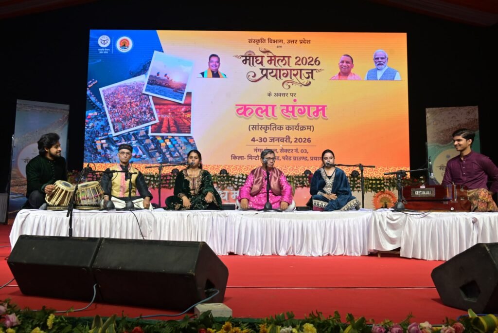 श्रद्धालूओं,सनातनियों एवं विभिन्न संस्कृतियों के संगम का स्थल माघ मेला 2026 प्रयागराज परेड ग्राउंड सेक्टर 3 स्थित संस्कृति विभाग उत्तर प्रदेश की ओर से कला संगम के आयोजन में  आज वाराणसी के प्रख्यात कलाकार देवाशीष डे ने शास्त्रीय संगीत की तान “नीलिमा लालिमा, कहुं श्वेता कहुं वेता”…….