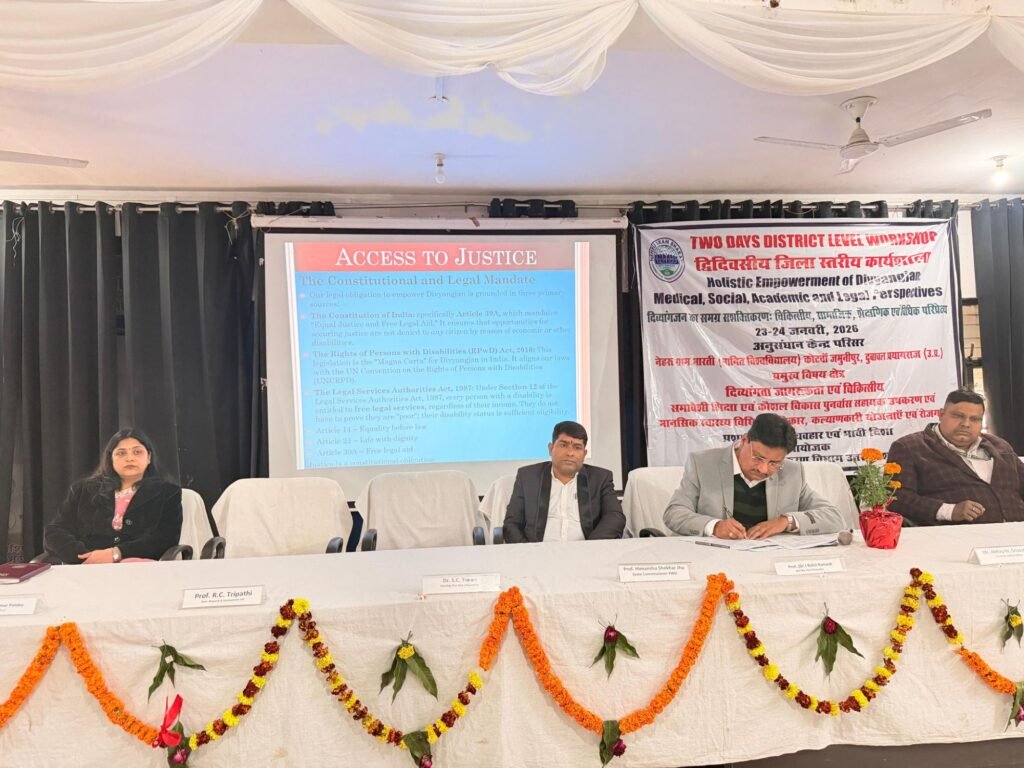 प्रयागराज : नेहरू ग्राम भारती (मानित विश्वविद्यालय), जमुनीपुर, प्रयागराज के विशेष शिक्षा संकाय द्वारा दिव्यांगजन सशक्तिकरण विभाग, उत्तर प्रदेश सरकार के प्रायोजन में आयोजित द्विदिवसीय जिला स्तरीय कार्यशाला के दूसरे एवं समापन दिवस पर दिव्यांगजन के विधिक अधिकारों, सामाजिक न्याय, रोजगार, कौशल विकास एवं समग्र सशक्तिकरण पर गहन एवं सार्थक विमर्श हुआ।