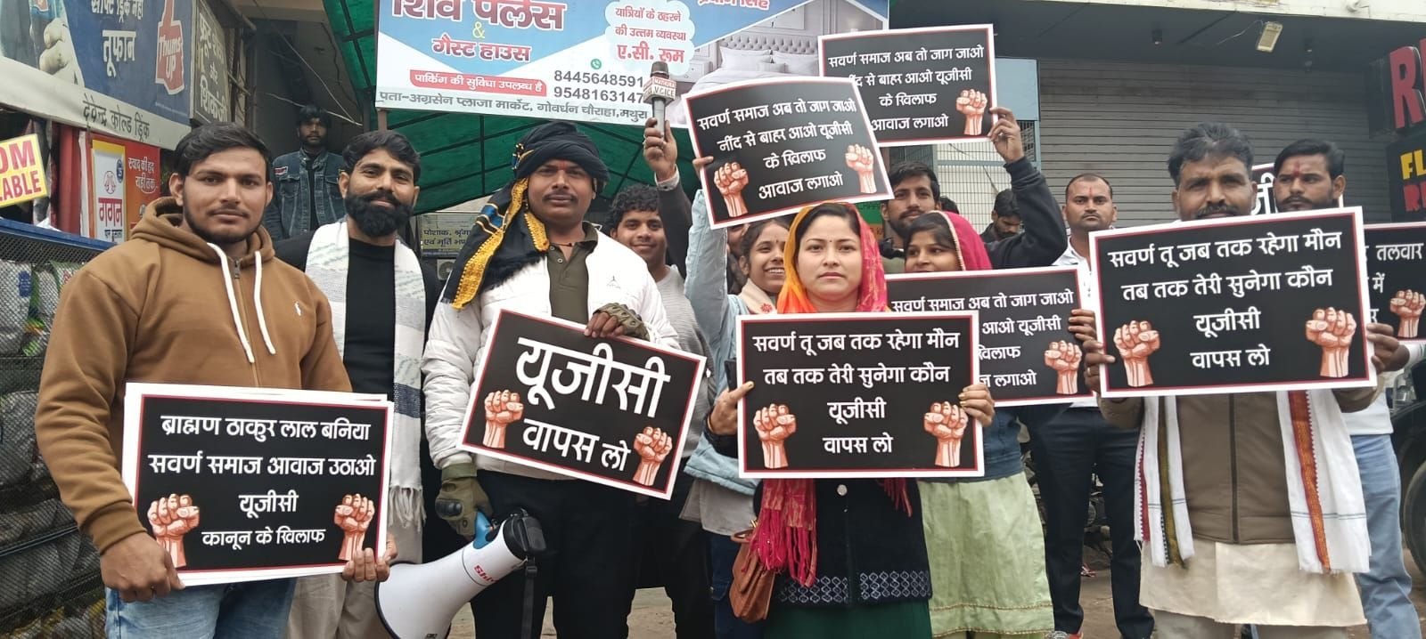 सरकार द्वारा लाए गए यूजीसी एक्ट के विरोध में सवर्ण समाज के तमाम संगठनों द्वारा बिल का विरोध किया गया। मथुरा के कृष्ण नगर से सवर्ण समाज के हजारों कार्यकर्ताओं द्वारा यूजीसी एक्ट के विरोध में मार्च निकाला गया। विरोध प्रदर्शन को रोकने के लिए भारी संख्या में पुलिस फोर्स मौके पर मौजूद रहा लेकिन सवर्ण समाज के हजारों लोगों की भीड़ बिल के खिलाफ नारे लगाते हुए आगे बढ़ती रही। भारी संख्या में भीड़ के प्रदर्शन की वजह से यातायात व्यवस्था भी चरमरा गई। मथुरा के तमाम थानों का फोर्स मौके पर पहुंच गया और प्रदर्शन को रोकने की कोशिश में जुट गया। विरोध प्रदर्शन में करणी सेना,क्षत्रीय समाज, राजपूत समाज, अखिल भारतीय क्षत्रिय सभा,ब्राह्मण महासभा आदि तमाम संगठन के लोगों ने हिस्सा लिया। पुलिस प्रशासन द्वारा विरोध प्रदर्शन को कृष्णा नगर में ही रोक लिया गया और सिटी मजिस्ट्रेट द्वारा प्रदर्शनकारियों से ज्ञापन लेकर उन्हें आश्वासन देकर धरना प्रदर्शन को शांत कर दिया गया।